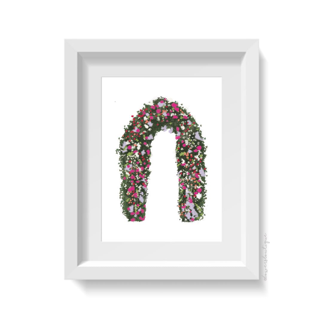 Featuring an illustration of a colourful flower arch with gorgeous green foliage and leaves.